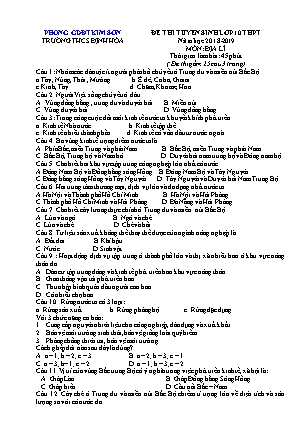 PHÒNG GDĐT KIM SƠN ĐỀ THI TUYỂN SINH LỚP 10 THPT TRƯỜNG THCS ĐỊNH HÓA Năm học 2018-2019 MÔN: ĐỊA LÍ Thời gian làm bài: 45 phút ( Đề thi gồm 25 câu 3 trang) Câu 1: Nhóm các dân tộc ít người phân bố chủ yếu ở Trung du và miền núi Bắc Bộ a.Tày, Nùng, Thái , Mường b. Ê đê, Cơ ho, Giarai c.Kinh, Tày d. Chăm, Khơme, Hoa Câu 2. Người Việt sống chủ yếu ở đâu A. Vùng đồng bằng , trung du và duyên hải B. Miền núi C. Vùng duyên hải D. Vùng đồng bằng Câu 3: Trong công cuộc đổi mới kinh tế nước ta khuyến khích phát triển a. Kinh tế Nhà nước b. Kinh tế tập thể c. Kinh tế nhiều thành phần d. Kinh tế có vốn đầu tư nước ngoài. Câu 4. Ba vùng kinh tế trọng điểm nước ta là A. Phía Bắc,miền Trung và phía Nam B. Bắc Bộ, miền Trung và phía Nam. C. Bắc Bộ, Trung bộ và Nam bô.. D. Duyên hải nam trung bộ và Đông nam bộ. Câu 5. Cho biết hai khu vực tập trung công nghiệp lớn nhất cả nước A.Đông Nam Bộ và Đồng bằng sông Hồng B. Đông Nam Bộ và Tây Nguyên C.Đồng bằng sông Hồng và Tây Nguyên D. Tây Nguyên và Duyên hải Nam Trung Bộ Câu 6. Hai trung tâm thương mại, dịch vụ lớn và đa dạng nhất nước ta A.Hà Nội và Thành phố Hồ Chí Minh B. Hà Nội và Hải Phòng C.Thành phố Hồ Chí Minh và Hải Phòng D. Đà Nẵng và Hải Phòng Câu 7. Cho biết cây lương thực chính ở Trung du và miền núi Bắc Bộ A. Lúa và ngô B. Ngô và chè C. Lúa và chè D. Chè và hồi Câu 8. Tư liệu sản xuất không thể thay thế được của ngành nông nghiệp là A. Đất đai B.Khí hậu C. Nước D.Sinh vật Câu 9 : Hoạt động dịch vụ tập trung ở thành phố lớn và thị xã nhiều hơn ở khu vực nông thôn do A. Dân cư tập trung đông và kinh tế phát triển hơn khu vực nông thôn B. Giao thông vận tải phát triển hơn C. Thu nhập bình quân đầu người cao hơn D. Có nhiều chợ hơn Câu 10. Rừng nước ta có 3 loại: a. Rừng sản xuất b. Rừng phòng hộ c. Rừng đặc dụng Với 3 chức năng cơ bản: 1. Cung cấp nguyên nhiên liệu cho công nghiệp, dân dụng và xuất khẩu 2. Bảo vệ môi trường sinh thái, bảo vệ giống loài quý hiếm 3. Phòng chống thiên tai, bảo vệ môi trường. Cách ghép đôi nào sau đây là đúng? A. a – 1; b – 2; c – 3 B. a – 2; b – 3; c – 1 C. a – 3; b– 1; c – 2 D. a – 1; b – 3; c – 2. Câu 11.Vị trí của vùng Bắc trung Bộ có ý nghĩa trong việc phát triển kinh tế, xã hội là: A. Giáp Lào B. Giáp Đồng bằng Sông Hồng C. Giáp biển D. Cầu nối Bắc – Nam. Câu 12. Cây chè ở Trung du và miền núi Bắc Bộ chiếm tỉ trọng lớn về diện tích và sản lượng so với cả nước do A. Thổ nhưỡng và khí hậu rất phù hợp B. Các vùng khác trong nước không thích hợp trồng chè C. Ngoài cây chè không trồng được bất kì cây nào khác Người tiêu dùng trong nước chỉ ưa chuộng chè của Trung du và miền núi Bắc Bộ Câu 13. Ngành thuỷ sản là một trong những thế mạnh của vùng Bắc trung Bộ nhờ A. Bờ biển dài B. Ít thiên tai C. Nhiều bãi tôm cá D. Tàu thuyền nhiều. Câu 14: Nguyên nhân cơ bản của việc đánh bắt ven bờ là A. Biển nhiều thiên tai B. Cá chủ yếu ở ven bờ C. Tàu thuyền nhỏ D. Chính sách Câu 15. Để phát triển kinh tế - xã hội ở trung du và miền núi, vấn đề hàng đầu phải giải quyết là: A. Nâng cao trình độ chuyên môn của lực lượng lao động. B. Đảm bảo về lương thực, thực phẩm. C. Phát triển mạng lưới giao thông vận tải. D. Phát triển mạng lưới điện và thủy lợi. Câu 16. Dựa vào Atlat địa lí Việt Nam (trang khí hậu) cho biết nước ta có mấy miền khí hậu A.3 B.4 C.2 D.5 Câu 17. Mặt hàng có giá trị xuất khẩu lớn nhất ở nước ta hiện nay là A. Gạo. B. Hàng may mặc. C. Dầu thô. D. Thủy sản Câu 18. Tỉnh có sản lượng khai thác than lớn nhất nước ta là: A. Quảng Ninh. B. Thái Nguyên. C. Lạng Sơn. D. Tuyên Quang. Câu 18.Dựa vào Atlat địa lí Việt Nam (trang dân số) và kiến thức đã học cho biết nhận định nào sau đây là không đúng về sự phân bố dân cư ở nước ta A.Tập trung đông ở đồng bằng và ven biển B. Thưa thớt ở miền núi và cao nguyên C. Cả A và B đều đúng D. Thưa thớt ở đồng bằng Câu 19. Cho bảng số liệu: Tổng sản phẩm trong nước(Đơn vị triệu USD) Năm 1998 Khu vực Nông –lâm – ngư nghiệp 77520 Công nghiệm –Xây dựng 92357 Dịch vụ 125819 Tổng 295696 Cơ cấu ngành dịch vụ là: A. 40,1% B. 42,6% C. 43,5% D. 45% Câu 20. Cho bảng số liệu: Giá trị sản xuất nông, lâm ,ngư nghiệp năm 2005 (Đơn vị: nghìn tỉ đồng) Năm 2005 ngành Tổng số 256387,8 Nông nghiệp 183342,4 Lâm nghiệp 9496,2 Thủy sản 63549,2 Ngành có quy mô giá trị sản xuất lớn nhất là: A.Nông nghiệp B.Lâm nghiệp C. Thủy sản D. Cả ba A,B,C đều sai. Câu 21: Phân theo trình độ, nguồn lao động nước ta chủ yếu là: A. Đã qua đào tạo B. Lao động trình độ cao C. Lao động đơn giản D. Chưa qua đào tạo Câu 22. Cho bảng số liệu : Sản lượng dầu mỏ, than và điện của nước ta giai đoạn 1990 - 2010 Năm 1990 1995 2000 2005 2010 Dầu mỏ ( triệu tấn ) 2,7 7,6 16,3 18,5 15,0 Than (triệu tấn ) 4,6 8,4 11,6 34.1 44,8 Điện ( tỉ kw/h ) 8,8 1