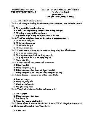 PHÒNG GDĐT KIM SƠN ĐỀ THI TUYỂN SINH VÀO LỚP 10 THPT TRƯỜNG THCS YÊN MẬT Năm học: 2018-2019 MÔN: Địa lí (Đề gồm 25 câu, trong 04 trang) I. CÂU HỎI NHẬN BIẾT (10 câu) Câu 1. Chất lượng cuộc sống ở nước ta đang được nâng cao, biểu hiện nào sau đây sai: A. Tỉ lệ người lớn biết chữ nâng lên B. Cơ cấu sử dụng lao động thay đổi theo hướng tích cực C. Thu nhập bình quân đầu người tăng D. Người dân được hưởng các dịch vụ xã hội tốt hơn Câu 2. Việt Nam hiện là nước có tốc độ phát triển điện thoại đứng: A. Thứ hai trên thế giới B. Thứ nhất trên thế giới C. Thứ ba trên thế giới D. Thứ tư trên thế giới Câu 3. Cơ cấu dân số theo độ tuổi của nước ta đang có sự thay đổi như sau: A. Tỉ lệ trẻ em giảm xuống B. Tỉ lệ người trong độ tuổi lao động tăng lên C. Tỉ lệ người trên độ tuổi lao động tăng lên D. Tất cả đều đúng Câu 4. Vùng trồng cây ăn quả lớn nhất nước ta là: A. Đông Nam Bộ B. Đồng bằng sông Hồng C. Đồng bằng sông Cửu Long và Đông Nam Bộ D. Đồng bằng sông Cửu Long và Đồng bằng sông Hồng Câu 5. Loại thiên tai ít gây thiệt hại ở Bắc Trung Bộ là: A. Bão, lụt, lũ quét B. Động đất, sóng thần C. Hạn hán, thiếu nước D. Gió phơn Tây Nam Câu 6. Vùng kinh tế có diện tích lớn nhất nước ta là: A. Tây Nguyên B. Đồng bằng sông Cửu Long C. Bắc Trung Bộ D. Trung du và miền núi Bắc Bộ Câu 7. Trong số các di sản văn hóa thế giới được UNESCO công nhận dưới đây, di sản không thuộc Duyên hải Nam Trung Bộ là: A. Cố đô Huế B. Phố cổ Hội An C. Di tích Mỹ Sơn D. Tất cả đều đúng Câu 8. Một số cây công nghiệp lâu năm ở vùng Đông Nam Bộ là: A. Cao su, cà phê, hồ tiêu, điều B. Cao su, lạc, thuốc lá C. Lạc, đậu tương, mía, cao su D. Cao su Câu 9. Các mặt hàng xuất khẩu chủ lực của vùng Đông Nam Bộ là: A. Dầu thô B. Thực phẩm chế biến C. Hàng may mặc, giày dép, đồ gỗ D. Tất cả các ý trên đều đúng Câu 10. Ở Đồng bằng sông Cửu Long, lúa được trồng chủ yếu ở: A. Kiên Giang, Sóc Trăng B. An Giang, Long An, Tiền Giang C. Đồng Tháp D. Tất cả đều đúng II . CÂU HỎI THÔNG HIỂU (10câu) Câu 11. Ý nào không thuộc thế mạnh kinh tế chủ yếu của Trung du và miền núi phía Bắc: A. Khai thác khoáng sản, phát triển thủy điện B. Trồng cây công nghiệp lâu năm, rau quả cận nhiệt và ôn đới C. Trồng cây lương thực, chăn nuôi gia cầm, cá D. Trồng và bảo vệ rừng Câu 12. Cây chè ở Trung du và miền núi Bắc Bộ chiếm tỉ trọng lớn về diện tích và sản lượng so với cả nước là do: A. Thổ nhưỡng và khí hậu rất phù hợp B. Các vùng khác trong nước không thích hợp trồng chè C. Ngoài cây chè không trồng được bất kì cây nào khác D. Người tiêu dùng trong nước chỉ ưa chuộng chè của Trung du và miền núi Bắc Bộ Câu 13. Khó khăn trong phát triển nông nghiệp ở Duyên hải Nam Trung Bộ là: A. Quỹ đất nông nghiệp hạn chế, đất xấu B. Địa hình khúc khuỷu, nhiều vũng, vịnh C. Thường bị thiên tai (hạn hán, bão lụt, cát lấn) D. Ý A và C đúng Câu 14. Khu vực công nghiệp phát triển mạnh ở Đông Nam Bộ là do những nguyên nhân sau: A. Vị trí địa lý thuận lợi B. Cơ sở hạ tầng phát triển C. Nguồn nhân công có kỹ thuật lành nghề D. Cả 3 ý trên đều đúng Câu 15. Nguyên nhân chính làm cho vùng Đồng bằng sông Hồng có năng suất lúa cao nhất cả nước là: A. Đất phù sa màu mỡ B. Khí hậu, thủy văn thuận lợi C. Thâm canh tăng năng suất, tăng vụ D. Nguồn lao động dồi dào Câu 16. Ngành đánh bắt thuỷ hải sản nước ta còn hạn chế là do: A. Thiên nhiên nhiều thiên tai B. Môi trường bị ô nhiễm, suy thoái C. Thiếu vốn đầu tư D. Ngư dân ngại đánh bắt xa bờ. Câu 17. Ngành công nghiệp năng lượng phát triển mạnh nhất ở Quảng Ninh là: A. Than B. Hoá dầu C. Nhiệt điện D.Thuỷ điện Câu 18. Sự phân bố của dịch vụ phụ thuộc nhiều yếu tố, nhưng quan trọng nhất là: A. Địa hình B. Sự phân bố công nghiệp C. Sự phân bố dân cư D. Khí hậu Câu 19. Nguyên nhân quan trọng nhất dẫn đến sự đổi thay to lớn của nông nghiệp nước ta trong những năm Đổi mới là: A. Đường lối đổi mới trong nông nghiệp B. Nông dân cần cù lao động C. Khí hậu thuận lợi D. Đất đai màu mỡ Câu 20. Vùng kinh tế trọng điểm Bắc Bộ thúc đẩy chuyển dịch cơ cấu kinh tế của: A. Vùng Bắc Trung Bộ B. Vùng Đông Nam Bộ C. Vùng Đồng bằng sông Hồng D. Vùng Đồng bằng sông Hồng, Trung du và miền núi Bắc Bộ. III . CÂU HỎI VẬN DỤNG (5 câu) Câu 21. Ý nghĩa của sông Mê Công đối với Đồng bằng sông Cửu Long? A. Nguồn nước tự nhiên dồi dào. B. Nguồn cá và thủy sản phong phú. C. Bồi đắp phù sa, mở rộng vùng đất Cà Mau. D. Tất cả các ý trên. Câu 22. Ý nào không thuộc khó khăn chính ở Đồng bằng sông Cửu Long? A. Vấn đề cải tạo và sử dụng hợp lí các loại đất mặn, đất phèn. B. Vấn đề lũ lụt do sông Mê Công gây ra trong mùa lũ. C. Xói mòn, sạt lở đất. D. Vấn đề thiếu nước ngọt. Câu 23. Cao su là cây