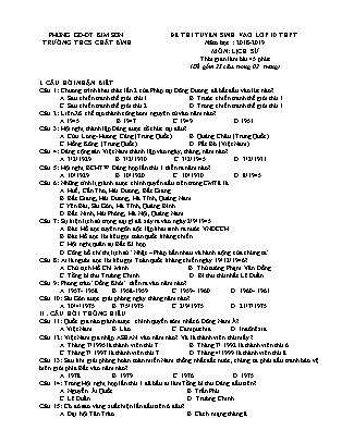 PHÒNG GD-ĐT KIM SƠN ĐỀ THI TUYỂN SINH VÀO LỚP 10 THPT TRƯỜNG THCS CHẤT BÌNH Năm học : 2018-2019 MÔN: LỊCH SỬ Thời gian làm bài 45 phút (Đề gồm 25 câu, trong 02 trang) I. CÂU HỎI NHẬN BIẾT Câu 1: Chương trình khai thác lần 2 của Pháp tại Đông Dương đã bắt đầu vào lúc nào? A. Sau chiến tranh thế giới thứ 1 B. Trước chiến tranh thế giới thứ 1 C. Sau chiến tranh thế giới thứ 2 D. Trong chiến tranh thế giới thứ 1 Câu 2: Liên Xô chế tạo thành công bom nguyên tử vào năm nào? A.1945 B.1947 C.1949 D.1951 Câu 3: Hội nghị thành lập Đảng được tổ chức tại đâu? A. Cửu Long- Hương Cảng (Trung Quốc) B. Quảng Châu (Trung Quốc) C. Hồng Kông (Trung Quốc) D. Pắc Bó (Việt Nam) Câu 4: Đảng cộng sản Việt Nam thành lập vào ngày, tháng, năm nào? A. 3/2/1929 B. 3/2/1930 C. 3/2/1945 D. 3/2/1931 Câu 5: Hội nghị BCHTW Đảng họp lần thứ 1 diễn ra năm nào? A. 10/1929 B. 10/1920 C. 10/1930 D. 8/1945 Câu 6: Những tỉnh lị giành được chính quyền đầu tiên trong CMT8 là A. Huế, Cần Thơ, Hải Dương, Bắc Giang B. Bắc Giang, Hải Dương, Hà Tĩnh, Quảng Nam C.Yên Bái, Sài Gòn, Hà Tĩnh, Quảng Bình D. Bắc Ninh, Hải Phòng, Hà Nội, Quảng Nam Câu 7: Sự kiện lịch sử trọng đại gì đã xảy ra vào ngày 2/9/1945 A. Bác Hồ đọc tuyên ngôn độc lập khai sinh ra nước VNDCCH B. Bác Hồ đọc lời kêu gọi toàn quốc kháng chiến C. Hội nghị quân sự Bắc Kì họp D. Công bố chỉ thị lịch sử “Nhật – Pháp bắn nhau và hành động của chúng ta” Câu 8: Ai là người đọc lời kêu gọi Toàn quốc kháng chiến ngày 19/12/1946? A. Chủ tịch Hồ Chí Minh B. Thủ tướng Phạm Văn Đồng C. Tổng bí thư Trường Chinh D. Bí thư thứ nhất Lê Duẩn Câu 9: Phong trào “Đồng Khởi” diễn ra vào năm nào? A. 1957- 1958 B. 1958-1959 C. 1959- 1960 D. 1960- 1961 Câu 10: Sài Gòn được giải phóng ngày tháng năm nào? A. 30/4/1975 B. 7/5/1975 C. 2/9/1975 D. 21/7/1975 II . CÂU HỎI THÔNG HIỂU Câu 11: Quốc gia nào giành được chính quyền sớm nhất ở Đông Nam Á? A.Việt Nam B. Lào C. Campuchia D. Inđônêxia Câu 12: Việt Nam gia nhập ASEAN vào năm nào? Và là thành viên thứ mấy ? A. Tháng 7/1995 là thành viên thứ 7 B. Tháng 7/ 1992 là thành viên thứ 6 C. Tháng 7/ 1997 là thành viên thứ 7 D. Tháng 4/1999 là thành viên thứ 8 Câu 13: Sau khi giải phóng hoàn toàn miền Nam thống nhất đất nước, chúng ta phải đấu tranh bảo vệ biên giới phía Bắc vào năm nào? A. 1978 B. 1979 C. 1976 D. 1975 Câu 14: Trong Hội nghị họp lần thứ 1 đã bầu ai làm Tổng bí thư Đảng đầu tiên? A. Nguyễn Ái Quốc B. Trần Phú C. Lê Duẩn D. Trường Chinh Câu 15: Cờ đỏ sao vàng xuất hiện lần đầu tiên ở đâu? A. Đại hội Tân Trào B. Cách mạng tháng 8 C. Xô Viết Nghệ Tĩnh D. Khởi nghĩa Nam Kỳ tại Mỹ Tho Câu 16: Đội Việt Nam tuyên truyền giải phóng quân được thành lập ngày tháng năm nào? Tại đâu? A. 22/12/1944 – Cao Bằng B. 22/11/1944 – Bắc Sơn C. 19/5/1941- Tân Trào D. 2/9/1945- Thái Nguyên Câu 17: Ai là người chỉ huy đội Việt Nam tuyên truyền giải phóng quân? A. Hoàng Sâm B. Võ Văn Kiệt C. Nông Đức Mạnh D. Võ Nguyên Giáp III . CÂU HỎI VẬN DỤNG CÂU HỎI VẬN DỤNG THẤP Câu 18: “Lúc đầu chính là chủ nghĩa yêu nước, chứ không phải chủ nghĩa cộng sản đã làm tôi tin theo Lênin, tin theo Quốc tế thứ ba”. Câu trên là lời phát biểu của: A. Tôn Đức Thắng B. Trần Phú C. Hồ Chí Minh D. Lê Hồng Phong Câu 19: “Nhằm thẳng quân thù, bắn” là câu nói của ai? A. Lê Minh Xuân B. Lê Anh Xuân C. Nguyễn Viết Xuân D. Bùi Thị Xuân Câu 20: “Bình Tây Đại nguyên Soái” là danh hiệu nhân dân phong cho thủ lĩnh : A. Trương Định B. Nguyến Hữu Huân C. Nguyễn Trung Trực D. Võ Duy Dương Câu 21: Đời sống của giai cấp nông dân Việt Nam được thể hiện rõ nét nhất trong tác phẩm văn học nào sau đây? A. Tinh thần thể dục (Nguyễn Công Hoan) B. Số đỏ (Vũ Trọng Phụng) C. Mùa lạc (Nguyễn Khải) D. Tắt đèn (Ngô Tất Tố) Câu 22: Trong việc thực hiện “chiến lược toàn cầu” Mĩ đã vấp phải thất bại, tiêu biểu ở đâu? A. Chiến tranh chống Cuba (1952 -1959) B. Chiến tranh xâm lược Việt Nam (1954 – 1975) C. Trong cuộc chiến tranh Triều Tiên (1950 -1953) D. Chiến tranh Trung Quốc (1946 -1949) CÂU HỎI VẬN DỤNG CAO Câu 23: “Cần vương” có nghĩa là : A. Giúp vua cứu nước B. Những điều bậc quân vương cần làm . C. Đứng lên cứu nước D. Chống Pháp xâm lược Câu 24: Sau chiến tranh thế giới thứ nhất, xã hội Việt nam có các giai cấp, tầng lớp : A. Địa chủ phong kiến, công nhân, nông dân, tư sản dân tộc, tư sản Pháp. B. Phong kiến, công nhân, nông dân, dân nghèo. C. Quan lại Pháp, địa chủ phong kiến, nông dân, công nhân, tư sản, tiểu tư sản. D. Địa chủ phong kiến, công nhân, tư sản, tiểu tư sản, nông dân. Câu 25: Giai cấp nào ngày càng cấu kết chặt chẽ với thực dân Pháp để đàn áp, bóc lột nông dân? A. tư sản mại bản. B. địa chủ phong kiến. C. tư sản dân tộc. D. công nhân. PHÒNG GDĐT KIM SƠN HƯỚNG DẪN CHẤM ĐÊ THI TUYỂN SINH TRƯỜNG THCS CHẤT BÌNH VÀO LỚP 10 THPT Năm học: 2018-2019 MÔN: LỊCH SỬ (Đáp án trong 01 trang) Câu Đáp 