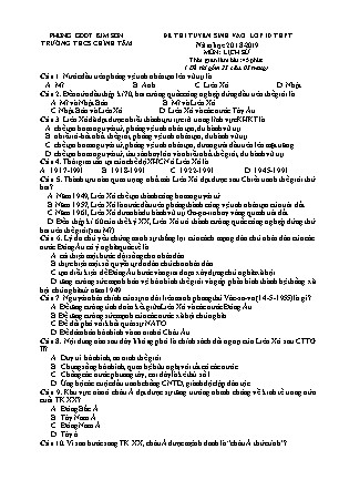 PHÒNG GDĐT KIM SƠN ĐỀ THI TUYỂN SINH VÀO LỚP 10 THPT TRƯỜNG THCS CHÍNH TÂM Năm học 2018-2019 MÔN: LỊCH SỬ Thời gian làm bài: 45 phút. ( Đề thi gồm 25 câu, 03 trang) Câu 1. Nước đầu tiên phóng vệ tinh nhân tạo lên vũ trụ là A. Mĩ. B. Anh. C. Liên Xô. D. Nhật. Câu 2. Đến nửa đầu thập kỉ 70, hai cường quốc công nghiệp đứng đầu trên thế giới là A. Mĩ và Nhật Bản. B. Mĩ và Liên Xô. C. Nhật Bản và Liên Xô. D. Liên Xô và các nước Tây Âu. Câu 3. Liên Xô đã đạt được nhiều thành tựu rực rỡ trong lĩnh vực KHKT là A. chế tạo bom nguyên tử, phóng vệ tinh nhân tạo, du hành vũ trụ. B. nhiều rô-bốt nhất thế giới, phóng vệ tinh nhân tạo, du hành vũ trụ. C. chế tạo bom nguyên tử, phóng vệ tinh nhân tạo, đưa người đầu tiên lên mặt trăng. D. chế tạo bom nguyên tử, tàu sân bay lớn và nhiều nhất thế giới, du hành vũ trụ. Câu 4. Thời gian tồn tại của chế độ XHCN ở Liên Xô là A. 1917-1991. B. 1918- 1991. C. 1922- 1991. D. 1945- 1991. Câu 5. Thành tựu nào quan trọng nhất mà Liên Xô đạt được sau Chiến tranh thế giới thứ hai? A. Năm 1949, Liên Xô chế tạo thành công bom nguyên tử. B. Năm 1957, Liên Xô là nước đầu tiên phóng thành công vệ tinh nhân tạo của trái đất. C. Năm 1961, Liên Xô đưa nhà du hành vũ trụ Ga-ga-rin bay vòng quanh trái đất. D. Đến thập kỉ 60 của thế kỷ XX, Liên Xô trở thành cường quốc công nghiệp đứng thứ hai trên thế giới (sau Mĩ). Câu 6. Lý do chủ yếu chứng minh sự thắng lợi của cách mạng dân chủ nhân dân của các nước Đông Âu có ý nghĩa quốc tế là A. cải thiện một bước đời sống cho nhân dân. B. thực hiện một số quyền tự do dân chủ cho nhân dân. C. tạo điều kiện để Đông Âu bước vào giai đoạn xây dựng chủ nghĩa xã hội. D. tăng cường sức mạnh bảo vệ hòa bình thế giới và góp phần hình thành hệ thống xã hội chủ nghĩa từ năm 1949. Câu 7. Nguyên nhân chính của sự ra đời liên minh phong thủ Vác-sa-va (14-5-1955) là gì? A. Để tăng cường tình đoàn kết giữa Liên Xô và các nước Đông Âu. B. Để tăng cường sức mạnh của các nước xã hội chủ nghĩa. C. Để đối phó với khối quân sự NATO. D. Để đảm bảo hòa bình và an ninh ở Châu Âu. Câu 8. Nội dung nào sau đây không phải là chính sách đối ngoại của Liên Xô sau CTTG II? A. Duy trì hòa bình, an ninh thế giới. B. Chung sống hòa bình, quan hệ hữu nghị với tất cả các nước. C. Chống các nước phương tây, coi đây là kẻ thù số 1. D. Ủng hộ các cuộc đấu tranh chống CNTD, giành độc lập dân tộc. Câu 9. Khu vực nào ở châu Á đạt được sự tăng trưởng nhanh chóng về kinh tế trong nửa cuối TK XX? A. Đông Bắc Á. B. Tây Nam Á. C. Đông Nam Á. D. Tây á. Câu 10. Vì sao bước sang TK XX, châu Á được mệnh danh là “châu Á thức tỉnh”? A. Vì phong trào giải phóng dân tộc phát triển mạnh mẽ. B. Vì nhân dân thoát khỏi sự thống trị của vua chúa phong kiến. C. Vì tất cả các nước châu Á giành được độc lập. D. Vì ở châu Á có nhiều nước giữ vị trí quan trọng trên trường quốc tế. Câu 11. Ngày ra đời của nước Cộng hòa Nhân dân Trung Hoa? A. 30/10/1949. B. 23/4/1949. C. 1/10/1949. D. 1/1/1979 Câu 12. Nội dung nào không phải là mục địch khi thành lập Hiệp hội các quốc gia Đông Nam Á? A. Tăng cường hợp tác giữa các nước trong khu vực. B. phát triển kinh tế, xã hội của các nước trong khu vực Đông Nam Á. C. Hạn chế ảnh hưởng của các cường quốc bên ngoài đối với khu vực. D. Chuẩn bị lực lượng để đối phó với các nước XHCN. Câu 13. Năm nước tham gia thành lập tổ chức ASEAN là A. Thái Lan, Singapo, Malaixia, Philippin, Inddonexia. B. Thái Lan, Brunay, Malaixia, Philippin, Inddonexia. C. Thái Lan, Singapo, Mianma, Philippin, Inddonexia. D. Thái Lan, Singapo, Malaixia, Philippin, Campuchia. Câu 14. Tháng 8/1945, khi phát xít Nhật đầu hàng đồng minh, nước nào sau đây giành chính quyền: A. Việt Nam, Lào. B. Lào, Campuchia. C. Xin-ga-po, Lào. D. In-đô-nê- xia, Việt Nam. Câu 15. Người da đen đầu tiên trong lịch sử Nam Phi trở thành tổng thống là: A. Nen-Xơn Man-đê-la. B. Kô-phi An-nan. C. Phi-đen Ca-xrơ-rô. D. Mác-tin Lu-thơ King. Câu 16. kẻ thù của người dân Nam phi là? A. CNTD cũ. B. CNTD mới. C. Chủ nghĩa Apacthai. D. CNTD cũ và mới. Câu 17. Tội ác lớn nhất của Chủ nghĩa Apacthai là A. Bóc lột tàn bạo người da đen. B. Gây chia rẽ nội bộ người Nam Phi. C. Tước quyền tự do của người da đen. D. Phân biệt chủng tộc và kì thị chủng tộc với người da đen. Câu 18. Nội dung nào không thuộc cải cách dân chủ ở Cuba? A. Quốc hữu hóa xí nghiệp của tư bản nước ngoài. B. Xây dựng chính quyền cách mạng các cấp. C. Thanh toán nạn mù chữ, phát triển y tế, giáo dục. D. Thiết lập quan hệ ngoại giao với các nước trong khu vực. Câu 19. Kinh tế Nhật trong thập kỉ 60 phát triển với tốc độ : A. Nhanh B. Chậm C. Đều đều D. Thần kì. Câu 20. Kế hoạch Macsan (1948) còn được gọi là A. kế hoạch khôi phục châu Âu B. kế hoạch phục hưng kinh tế các nước Tây Âu C. kế hoạch phục hưng châu Âu D. kế ho