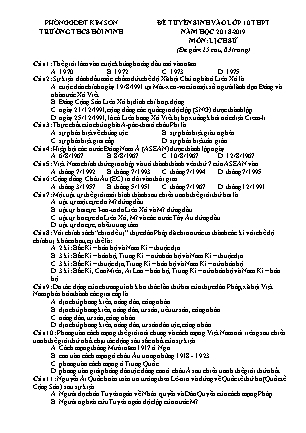 PHÒNG GDĐT KIM SƠN ĐỀ TUYỂN SINH VÀO LỚP 10 THPT TRƯỜNG THCS HỒI NINH NĂM HỌC 2018-2019 MÔN: LỊCH SỬ (Đề gồm 25 câu, 03 trang) Câu 1: Thế giới lâm vào cuộc khủng hoảng dầu mỏ vào năm A. 1970. B. 1972. C. 1973 D. 1975 Câu 2: Sự kiện đánh dấu mốc chấm dứt chế độ Xã hội Chủ nghĩa ở Liên Xô là A. cuộc đảo chính ngày 19/8/1991 tại Mát-xcơ-va của một số người lãnh đạo Đảng và nhà nước Xô Viết. B. Đảng Cộng Sản Liên Xô bị đình chỉ hoạt động. C. ngày 21/12/1991, cộng đồng các quốc gia độc lập (SNG) được thành lập. D. ngày 25/12/1991, lá cờ Liên bang Xô Viết bị hạ xuống khỏi nóc điện Crem-li. Câu 3: Thực chất của chủ nghĩa A-pác-thai ở châu Phi là A. sự phân biệt về chủng tộc. B. sự phân biệt giàu nghèo. C. sự phân biệt giai cấp. D. sự phân biệt tôn giáo. Câu 4: Hiệp hội các nước Đông Nam Á (ASEAN) được thành lập ngày A. 6/8/1967. B. 8/8/1967. C. 10/8/1967. D. 12/8/1967. Câu 5: Việt Nam chính thức gia nhập và trở thành thành vên thứ 7 của ASEAN vào A. tháng 7/1992. B. tháng 7/1993. C. tháng 7/1994. D. tháng 7/1995. Câu 6: Cộng đồng Châu Âu (EC) ra đời vào thời gian A. tháng 3/1957. B. tháng 5/1951. C. tháng 7/1967. D. tháng 12/1991. Câu 7: Một trật tự thế giới mới hình thành sau chiến tranh thế giới thứ hai là A. trật tự một cực do Mĩ đứng đầu. B. trật tự hai cực I-an-ta do Liên Xô và Mĩ đứng đầu. C. trật tự ba cực do Liên Xô, Mĩ và các nước Tây Âu đứng đầu. D. trật tự đa cực, nhều trung tâm. Câu 8: Với chính sách “chia để trị” thực dân Pháp đã chia nước ta thành các kì với chế độ chính trị khác nhau, cụ thể là: A. 2 kì: Bắc Kì – bảo hộ và Nam Kì – thuộc địa. B. 3 kì: Bắc Kì – bảo hộ, Trung Kì – nửa bảo hộ và Nam Kì – thuộc địa. C. 3 kì: Bắc Kì – thuộc địa, Trung Kì – bảo hộ và Nam Kì – nửa bảo hộ. D. 3 kì: Bắc Kì, Cao Miên, Ai Lao – bảo hộ, Trung Kì – nửa bảo hộ và Nam Kì – bảo hộ. Câu 9: Do tác động của chương trình khai thác lần thứ hai của thực dân Pháp, xã hội Việt Nam phân hóa thành các giai cấp là A. địa chủ phong kiến, nông dân, công nhân. B. địa chủ phong kiến, nông dân, tư sản, tiểu tư sản, công nhân. C. nông dân, tư sản, công nhân. D. địa chủ phong kiến, nông dân, tư sản dân tộc, công nhân. Câu 10: Phong trào cách mạng thế giới nói chung và cách mạng Việt Nam nói riêng sau chiến tranh thế giới thứ nhất chịu tác động sâu sắc nhất của sự kiện A. Cách mạng tháng Mười năm 1917 ở Nga. B. cao trào cách mạng ở châu Âu trong những 1918 - 1923. C. phong trào cách mạng ở Trung Quốc. D. phong trào giải phóng dân tộc dâng cao ở châu Á sau chiến tranh thế giới thứ nhất. Câu 11: Nguyễn Ái Quốc hoàn toàn tin tưởng theo Lê-nin và đứng về Quốc tế thứ ba (Quốc tế Cộng Sản) sau sự kiện A. Người đọc bản Tuyên ngôn về Nhân quyền và Dân Quyền của cách mạng Pháp. B. Người nghiên cứu Tuyên ngôn độc lập của nước Mĩ. C. Người đọc sơ thảo lần thứ nhất những luận cương về vấn đề dân tộc và vấn đề thuộc địa của Lê-nin. D. Người nghiên cứu Nghị quyết Đại hội lần thứ nhất của Quốc tế Cộng sản. Câu 12: Con đường mà Nguyễn Ái Quốc tìm ra cho dân tộc Việt Nam là A. con đường cách mạng bạo lực. B. con đường cách mạng tư sản. C. con đường cách mạng vô sản. D. con đường cách mạng giải phóng dân tộc. Câu 13: Từ cuối năm 1928 đến đầu năm 1929, ở nước ta xuất hiện nhu cầu cấp thiết thành lập một Đảng Cộng Sản vì A. xu thế chung của phong trào cách mạng lúc bấy giờ. B. sự phát triển mạnh mẽ của phong trào dân tộc dân chủ, đặc biệt là phong trào công nông theo cách mạng vô sản. C. thực dân Pháp tăng cường đàn áp phong trào cách mạng nên cần có chính Đảng cộng sản để lãnh đạo phong tào vượt qua khó khăn. D. thực hiện chỉ đạo của Quốc tế Cộng sản về việc phải thành lập một chính đảng cộng sản. Câu 14: Về hình thức và phương pháp đấu tranh trong những năm 1936-1939, Đảng ta chủ trương A. đấu tranh vũ trang là chính, kết hợp đấu tranh chính trị. B. đấu tranh chính trị bằng lực lượng quần chúng là chủ yếu, hạn chế sử dụng bạo lực. C. triệt để lợi dụng các hình thức đấu tranh hợp pháp và nửa công khai, công khai và nửa công khai. D. đẩy mạnh đấu tranh nghị trường để hỗ trợ cho các cuộc đấu tranh vũ trang. Câu 15: Thời cơ Tổng khởi nghĩa tháng Tám năm 1945 được Đảng ta xác định là A. trước khi Nhật đầu hàng Đồng Minh. B. sau khi Nhật đầu hàng Đồng minh và trước khi quân Đồng minh kéo vào nước ta. C. sau khi quân Đồng minh kéo vào nước ta làm nhiệm vụ giải giáp vũ khí quân Nhật. D. sau khi quân Đồng Minh hoàn thành nhiệm vụ giải giáp quân Nhật và rút khỏi nước ta. Câu 16: Nguyên nhân trực tiếp dẫn đến sự thành công của Cách mạng tháng Tám năm 1945 ở nước ta là A. có khối liên minh công nông vững chắc. B. sự lãnh đạo kịp thời, sáng tạo của Đảng và lãnh tụ Hồ Chí Minh. C. sự ủng hộ